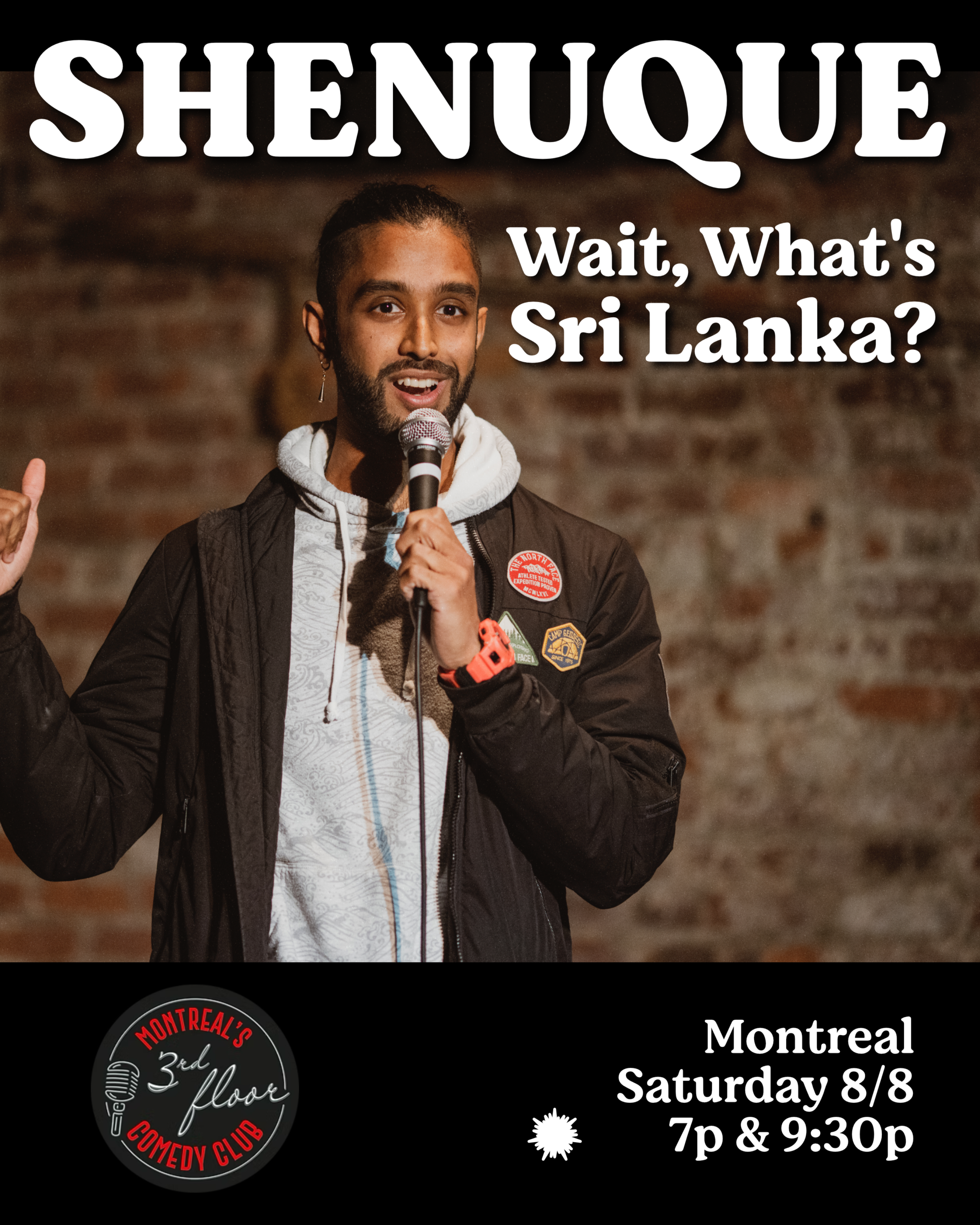 One VIP ticket to see Shenuque on August 8th, 2026 perform at the 3rd Floor Comedy Club located at 2015 Rue Crescent, H3G 2C1, in the heart of downtown Montreal.